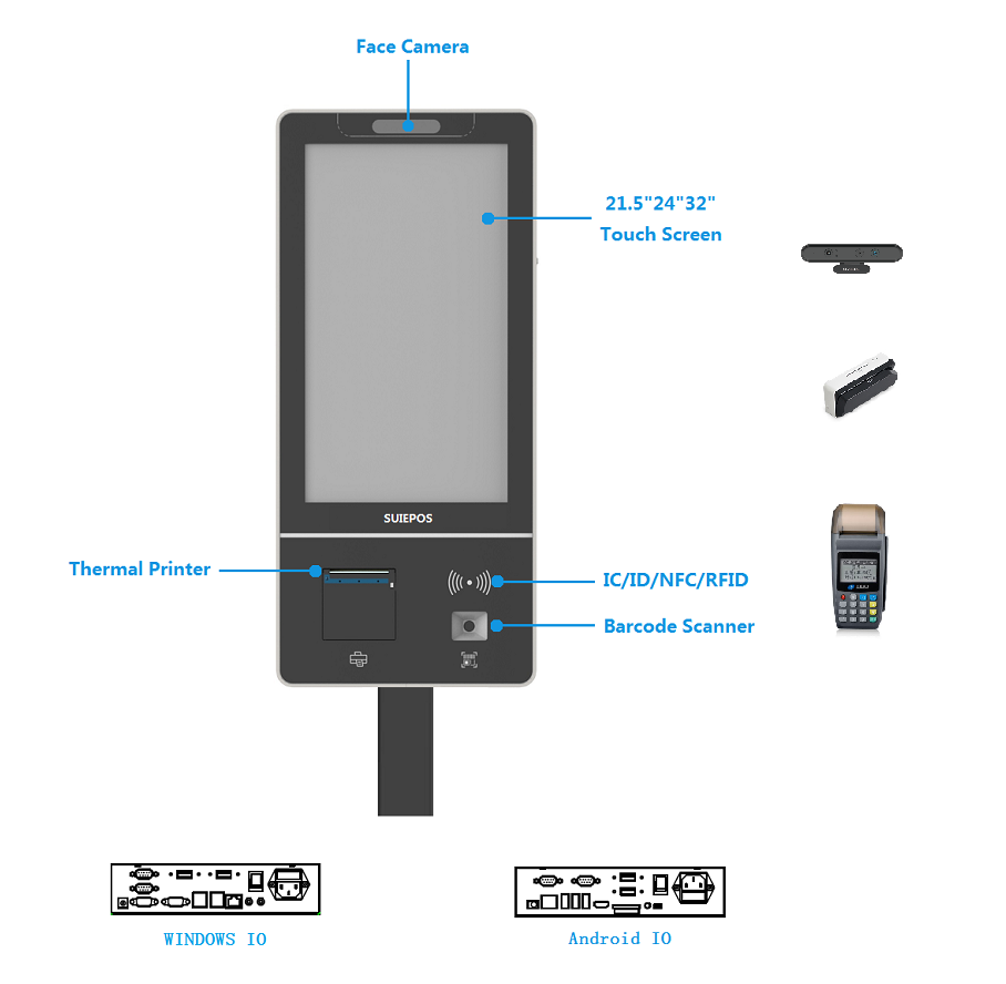 Optional accessories: QR code scanner, card reader NFC, 58/80mm thermal printer